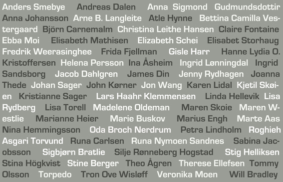 Marianne Heier (prosjektleder), Runa Carlsen, Therese Ellefsen, Silje Rønneberg Hogstad, Karen Lidal, Ingrid Lønningdal, Veronika Moen, Oda Broch Nerdrum, Elizabeth Schei, Maren Skoie, Elisabet Storhaug, Linda Hellevik, Maren Westlie, Tron Ove Wisløff og Ina Åsheim.